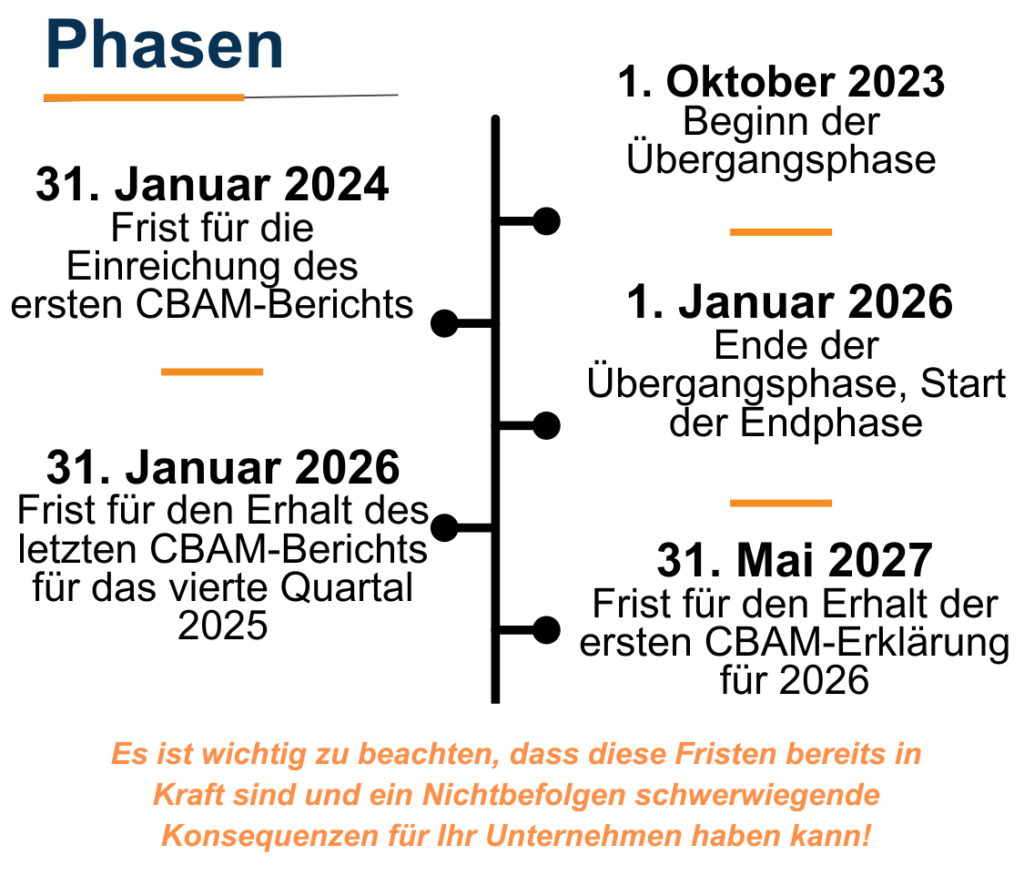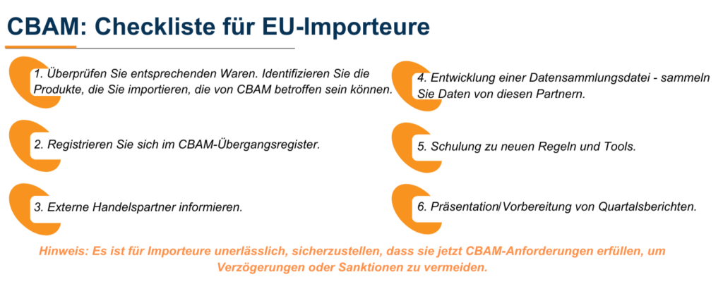 - Engagement und Unterstützung für Importeure: regelmäßige Kommunikation über CBAM-Phasen.